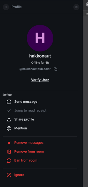 Screenshot of an account in the "People" sidebar of Element Web. Several buttons are visible, notably "Ban from room".